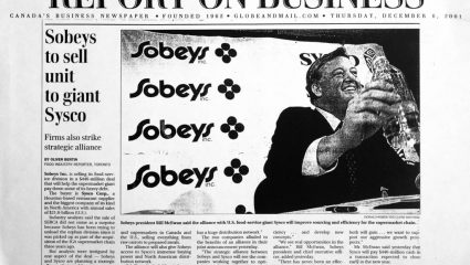 Sobeys purchases Safeway Canada, and adds 213 stores in Western Canada to the national chain. The first Sobeys Extra store opens in Burlington, Ont., designed around a “better food for all” mission.